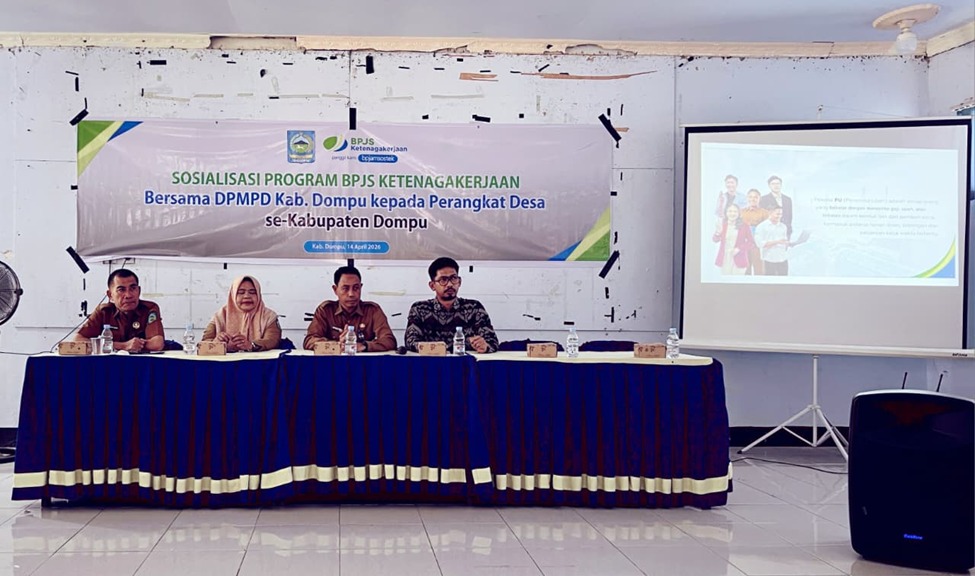 Halo Bima — Bertempat di gedung PKK Kabupaten Dompu, Selasa, 14/04/2026, BPJS Ketenagakerjaan Bima bersama Sekretaris Daerah, Disnakertrans, Dinas DPMPD serta Bappeda Kab Dompu mensosialisasikan program manfaat jaminan sosial ketenagakerjaan kepada seluruh perangkat pemerintahan desa di Kab Dompu.